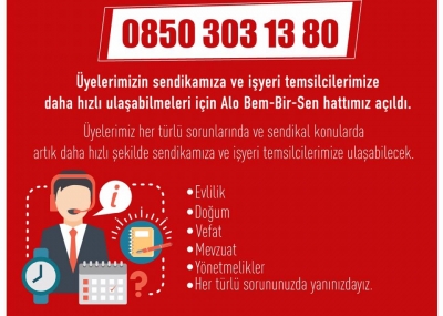 Üyelerimizin sendikamıza ve işyeri temsilcilerimize daha hızlı ulaşabilmeleri için Alo Bem-Bir-Sen hattımız açıldı.